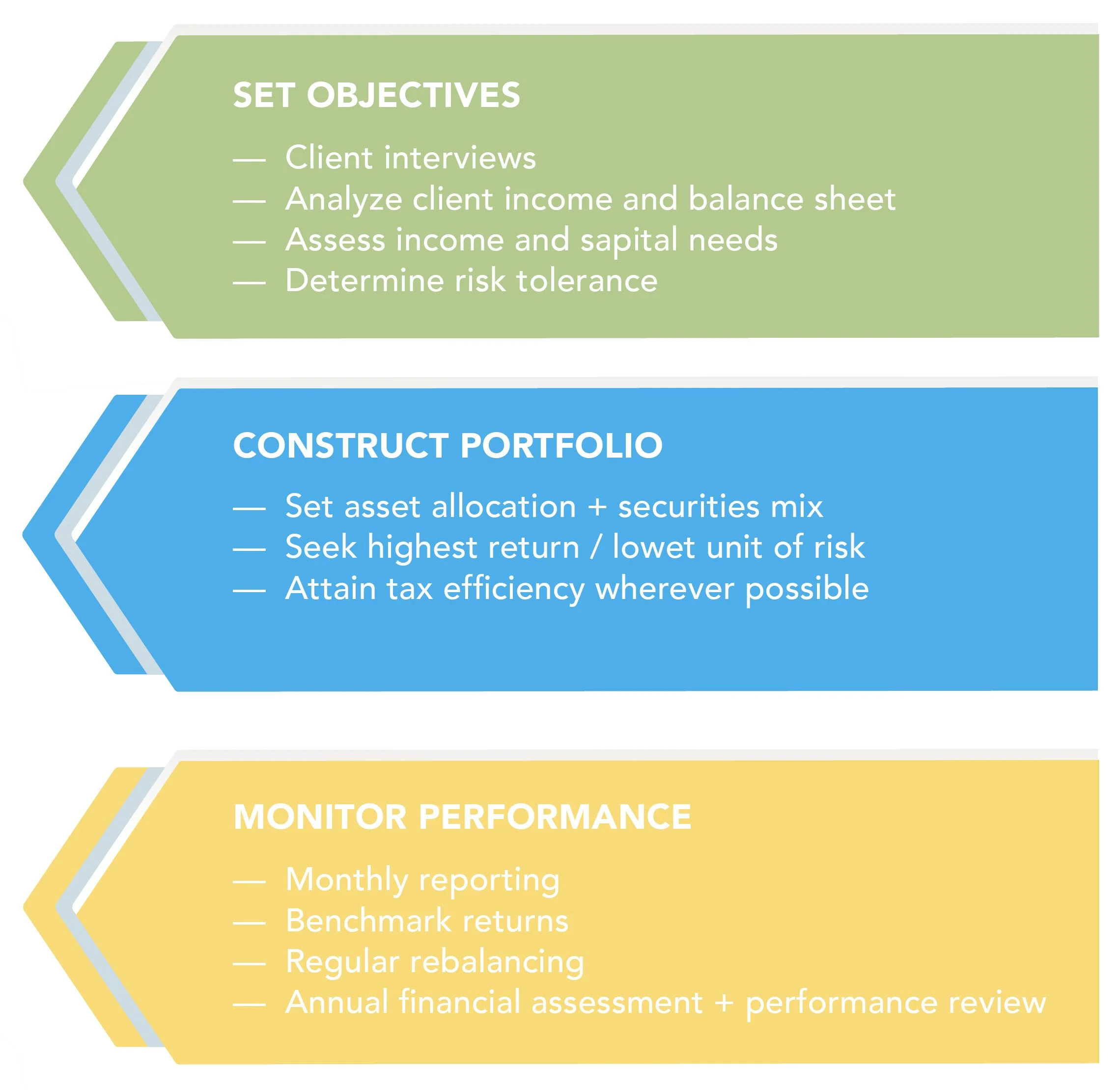 We arrive at a client investment strategy by means of extensive interviews and a detailed presentation of your historical and projected income statement, balance sheet and cash flow needs. Your financial profile is updated annually to make sure that the investment strategy remains appropriate for your circumstances and prospects. We also seek to optimize tax efficiency wherever possible through the harvesting of capital gains/losses as opportunities arise.